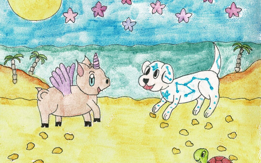 „Wuff! Wuff!“, bellt der kleine Hund freundlich „Ich bin Hades, der Sternenhund. Ich komme von den Sternen und suche ein neues Abendteuer. Kannst du mir helfen, kleines…..Schweinchen?“, fragt Hades und legt den Kopf schief.